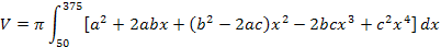 The volume of the center section may be found using the disk method of integration on the interval [50, 375]. |