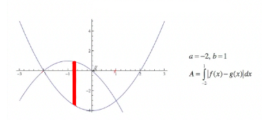 To find a and b, we need to find where the y values are the same, so we need to find where f(x) = g(x). Set f(x) = g(x) and solve. Since it is a quadratic, we set it equal to zero. It's a good practice to set it equal to zero, because if you can't solve the equation, you can always solve it numerically by using a method like Newton's method or the quadratic formula that will find the zeros of the function. To solve the equation, we set it equal to zero, factor out a 2, factor x2 + x − 2 (and if you can't factor it, you can use the quadratic formula), and we get the results x = −2 and x = 1. So a = −2 and b = 1. |