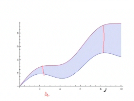 This is a nice way to state it mathematically; but in reality, we have to figure out which function is the greater function and which function is below that, so that when we subtract we get a positive number and we can replace the absolute value with an actual algebraic expression. What we really want to end up with is the algebraic expression f minus g—whatever that comes out to be—since f is greater than g, that will always be positive, and the absolute value of a positive is just itself. That's our goal—to get rid of the absolute value. |