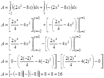 Check (by test cases or by looking at the graph) that g(x) > f(x) on (−2, 0) and that f(x) > g(x) on (0, 2), thus,